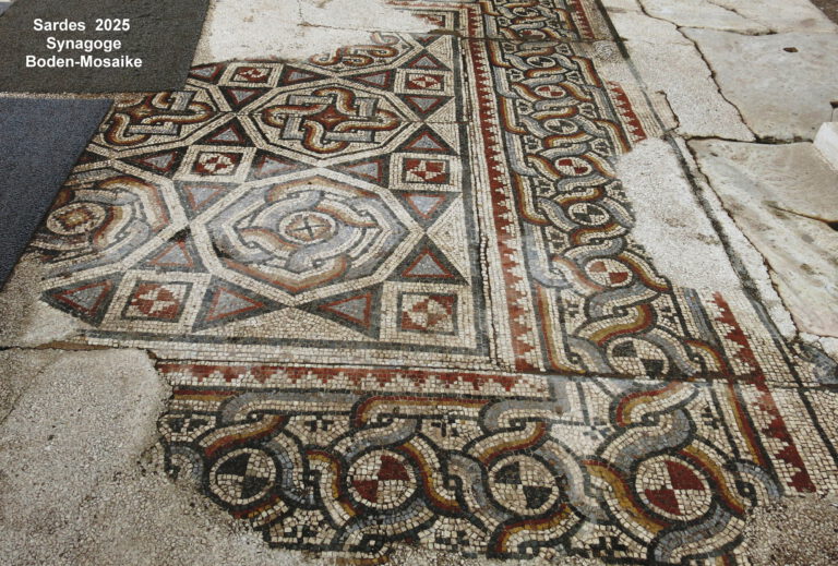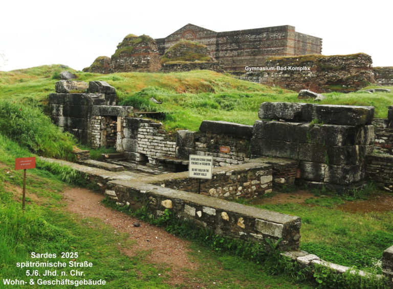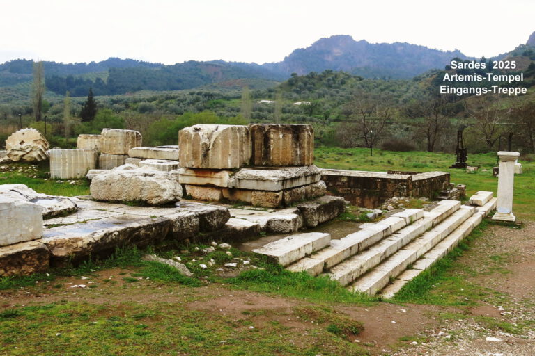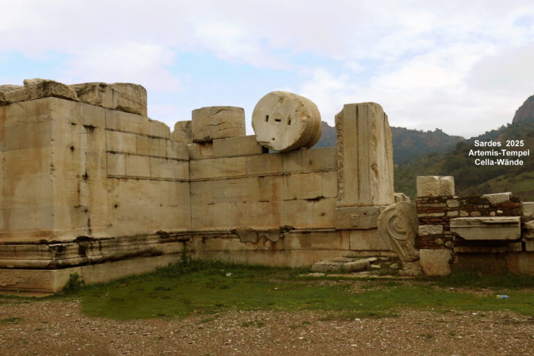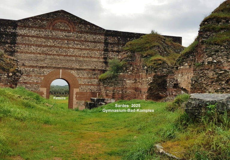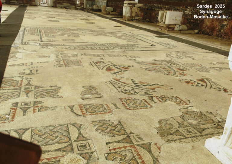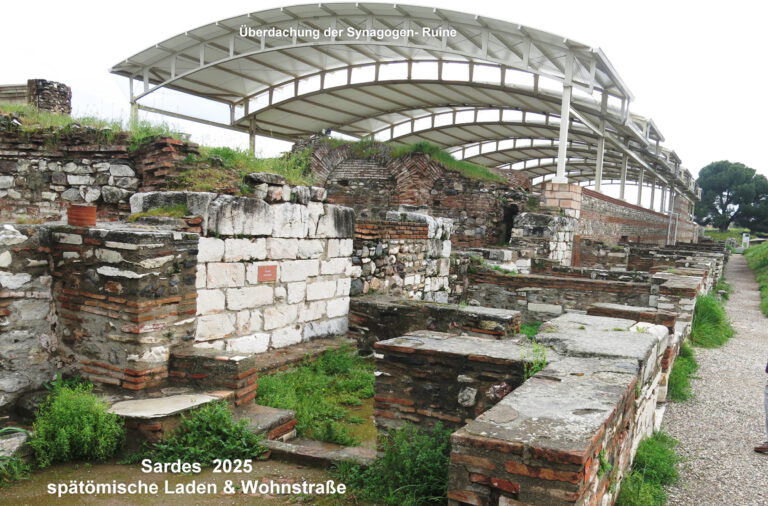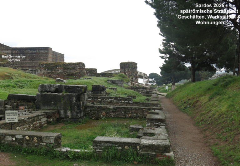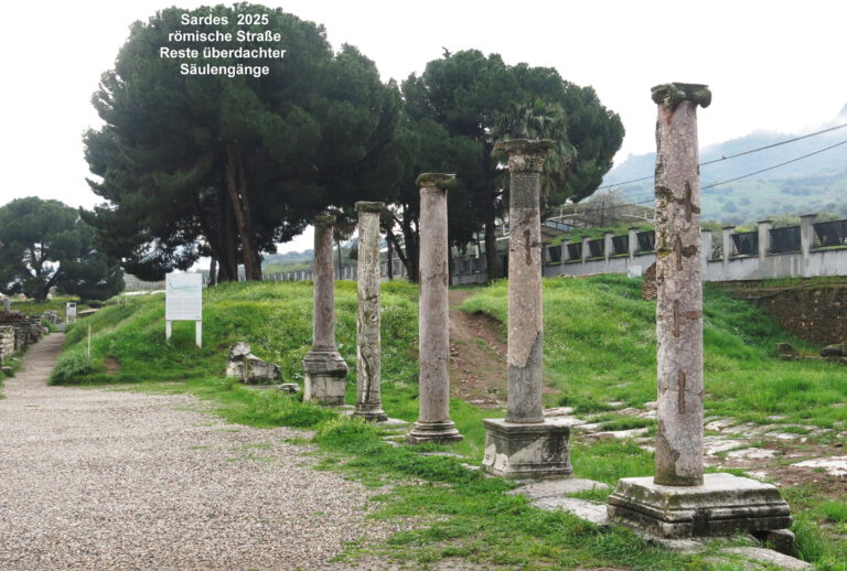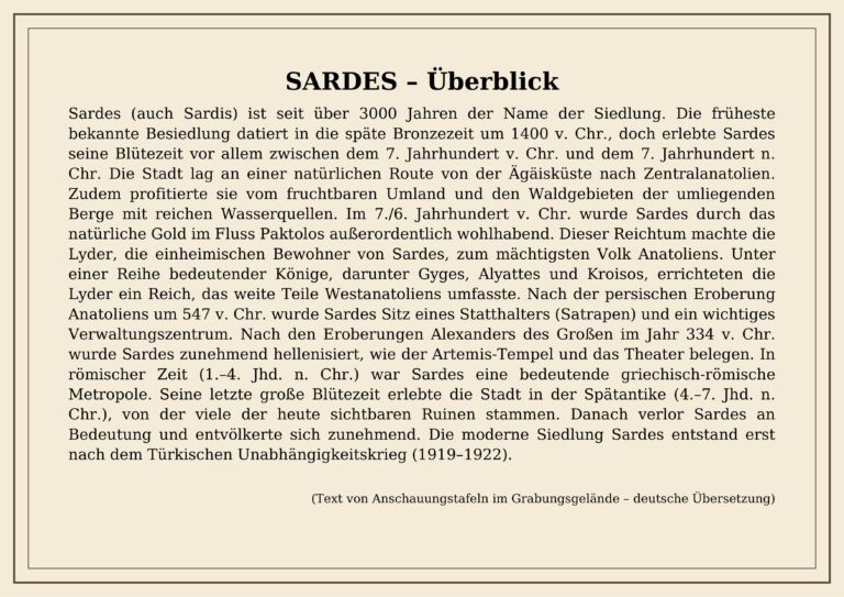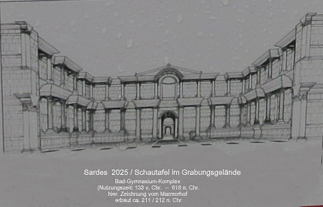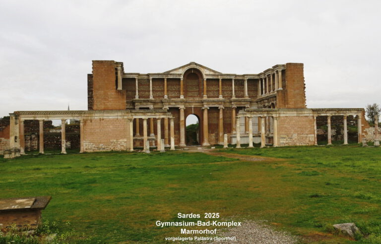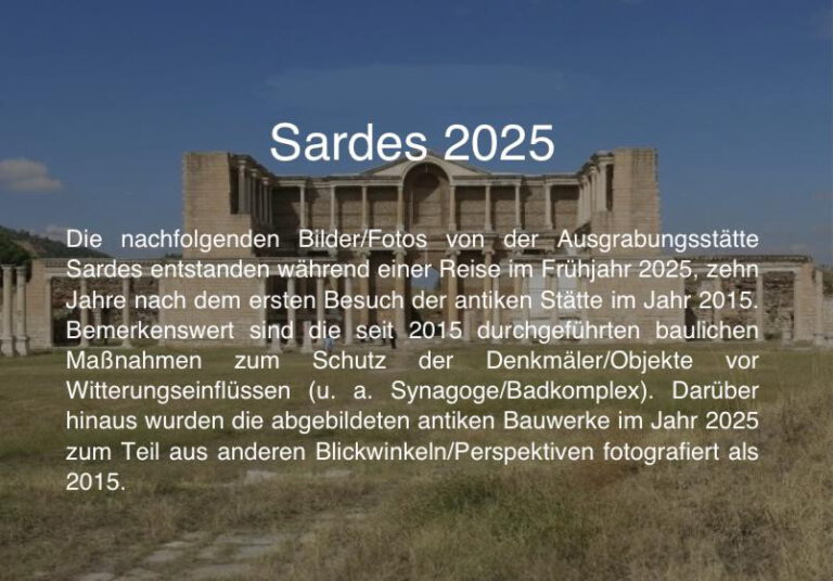 Nach religionsgeschichtlicher Darstellung soll in Sardes kurz nach dem Tod Jesu eine urchristliche Gemeinde entstanden sein, wofür die frühere Ansiedlung jüdischer Veteranen eine günstige Bedingung war. Sardes war eine der sieben Gemeinden der Offenbarung des Johannes, in der diese Gemeinden im Geiste des Urchristentums ermuntert und in ihrem urchristlichen Glauben bestärkt wurden. Die Ruinenstätte gliedert sich in zwei Bereiche: Die „alte“ Stadt wird geprägt durch den Tempel der Artemis. Die Gründung der Kultstätte der Artemis soll im 5. Jhd. v. Chr. unter griechischem Einfluss erfolgt sein. Sie führte die Tradition des lydischen Kybele-Kultes fort. Im Ionischen Aufstand von 499 v. Chr. wurde der Tempel zerstört. Der wiedererstehende Bau sollte zu den größten Tempelbauten in Kleinasien zählen, wurde aber nie vollendet. Von der geplanten Dimension des Tempels zeugen die gigantischen Säulenreste. Neben dem Tempel wurde in frühbyzantinischer Zeit eine Kapelle errichtet. Der neue Stadtteil, der von den Römern erschaffen wurde, umfasst eine spätantike Laden-Straße, eine Synagoge und einen Bad-Gymnasion-Komplex mit einer sehr großen Palästra .(Sporthof). 211 n. Chr. wurde diese Gesamtanlage fertiggestellt, deren Kernstück der vollständig restaurierte Marmorhof ist. Der Bau besticht durch seinen Marmorschmuck und die sehr gelungene Ausführung der spiralig gedrehten Kanneluren der Säulen. Die Synagoge hatte eine gediegene Marmorausstattung, beherbergte zwei Schreine für die Aufbewahrung der Thorarollen und einen Atlar, an dessen Seiten sich bis heute Löwenskulpturen befinden. Artikel bei Wikipedia zu: SARDES