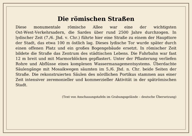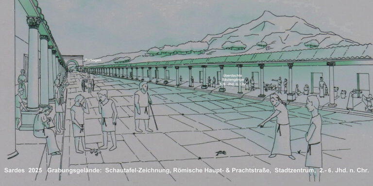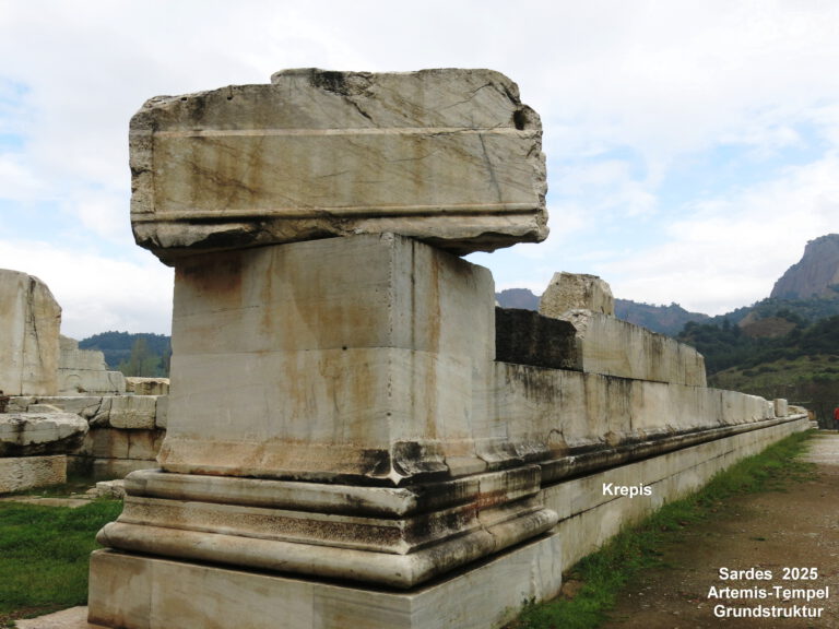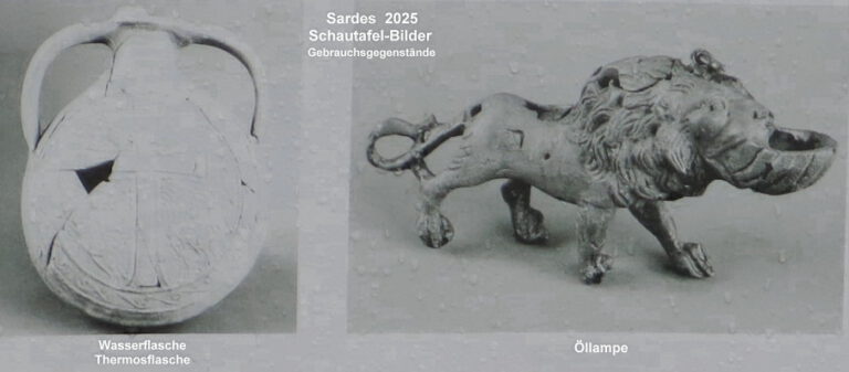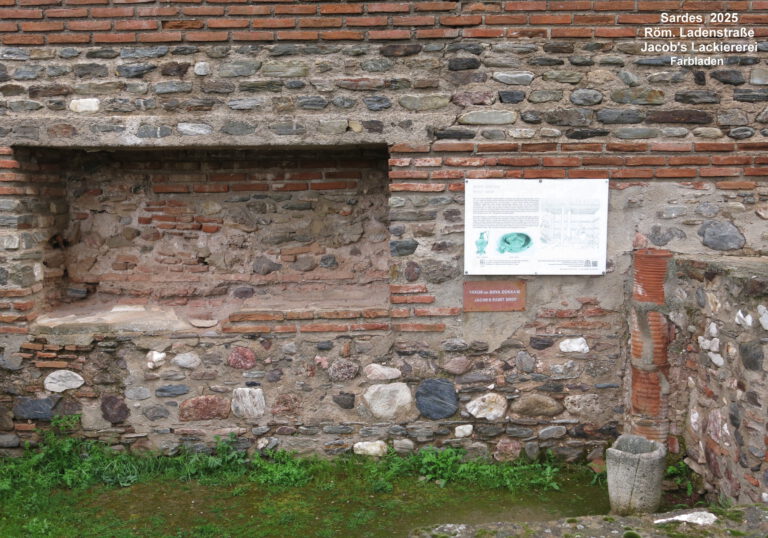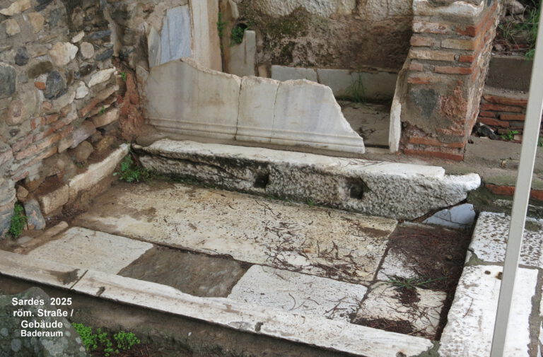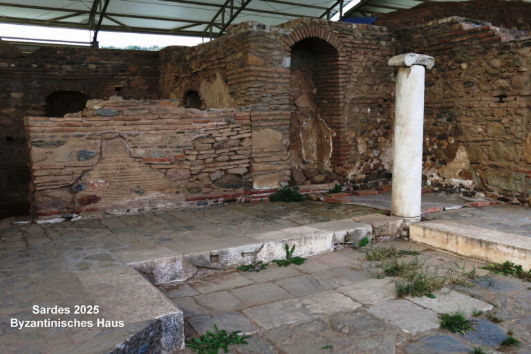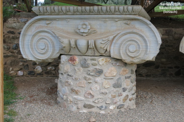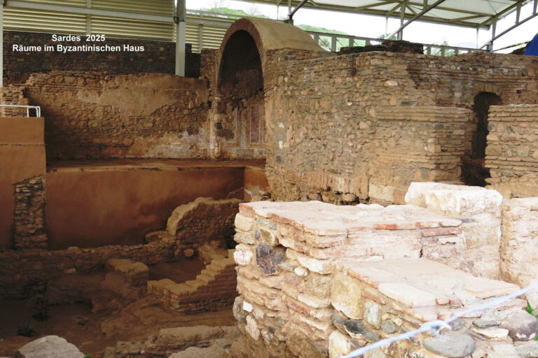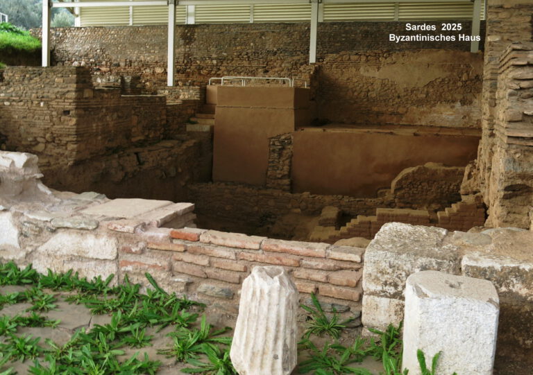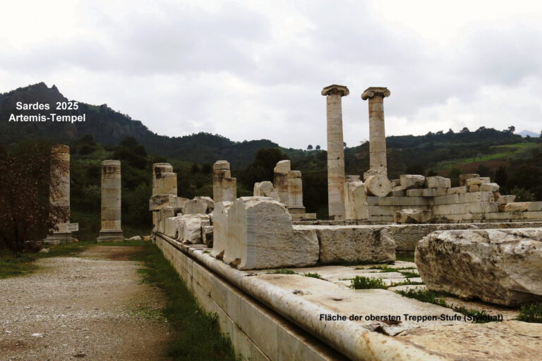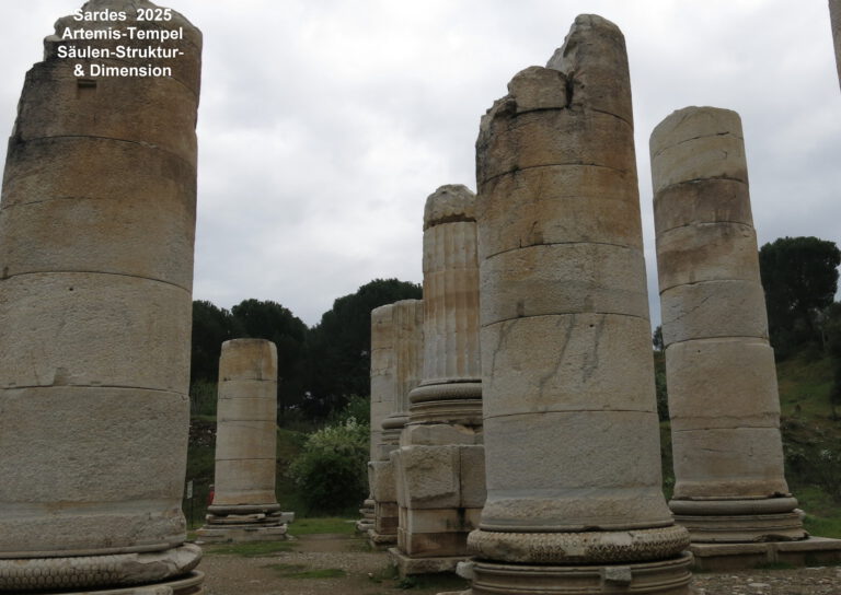Nach religionsgeschichtlicher Darstellung soll in Sardes kurz nach dem Tod Jesu eine urchristliche Gemeinde entstanden sein, wofür die frühere Ansiedlung jüdischer Veteranen eine günstige Bedingung war. Sardes war eine der sieben Gemeinden der Offenbarung des Johannes, in der diese Gemeinden im Geiste des Urchristentums ermuntert und in ihrem urchristlichen Glauben bestärkt wurden. Die Ruinenstätte gliedert sich in zwei Bereiche: Die „alte“ Stadt wird geprägt durch den Tempel der Artemis. Die Gründung der Kultstätte der Artemis soll im 5. Jhd. v. Chr. unter griechischem Einfluss erfolgt sein. Sie führte die Tradition des lydischen Kybele-Kultes fort. Im Ionischen Aufstand von 499 v. Chr. wurde der Tempel zerstört. Der wiedererstehende Bau sollte zu den größten Tempelbauten in Kleinasien zählen, wurde aber nie vollendet. Von der geplanten Dimension des Tempels zeugen die gigantischen Säulenreste. Neben dem Tempel wurde in frühbyzantinischer Zeit eine Kapelle errichtet. Der neue Stadtteil, der von den Römern erschaffen wurde, umfasst eine spätantike Laden-Straße, eine Synagoge und einen Bad-Gymnasion-Komplex mit einer sehr großen Palästra .(Sporthof). 211 n. Chr. wurde diese Gesamtanlage fertiggestellt, deren Kernstück der vollständig restaurierte Marmorhof ist. Der Bau besticht durch seinen Marmorschmuck und die sehr gelungene Ausführung der spiralig gedrehten Kanneluren der Säulen. Die Synagoge hatte eine gediegene Marmorausstattung, beherbergte zwei Schreine für die Aufbewahrung der Thorarollen und einen Atlar, an dessen Seiten sich bis heute Löwenskulpturen befinden. Artikel bei Wikipedia zu: SARDES