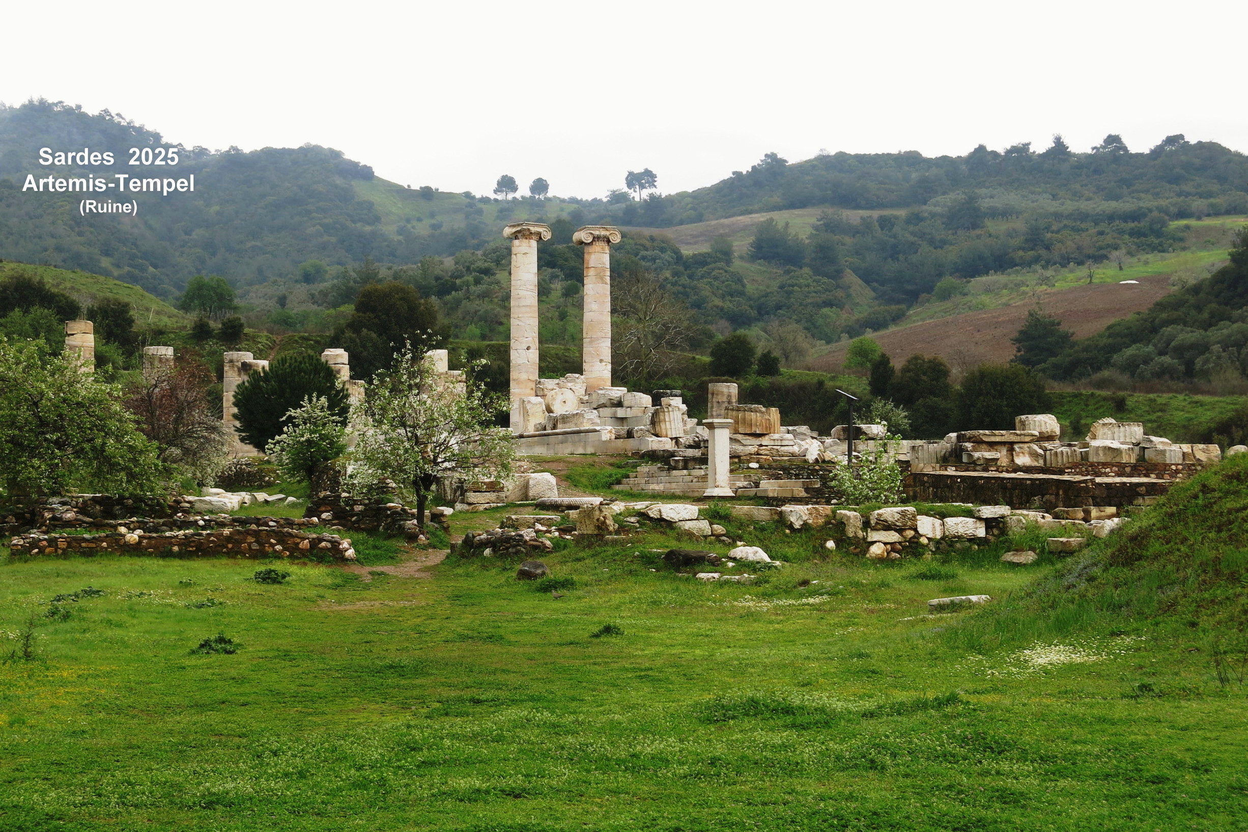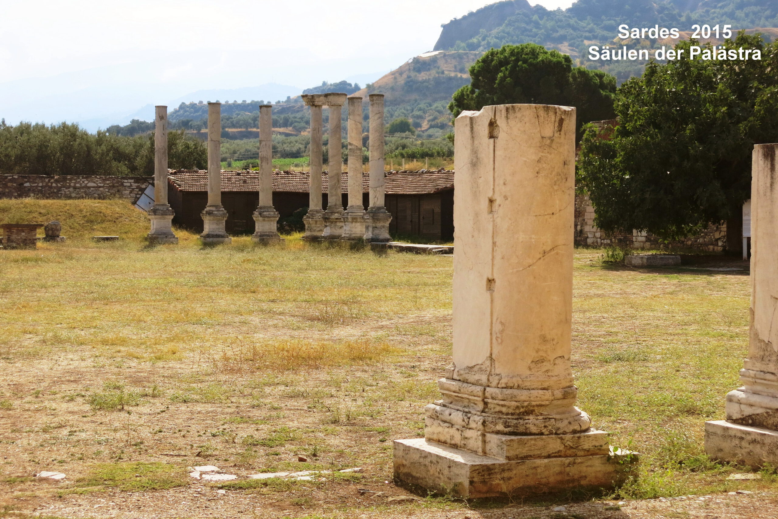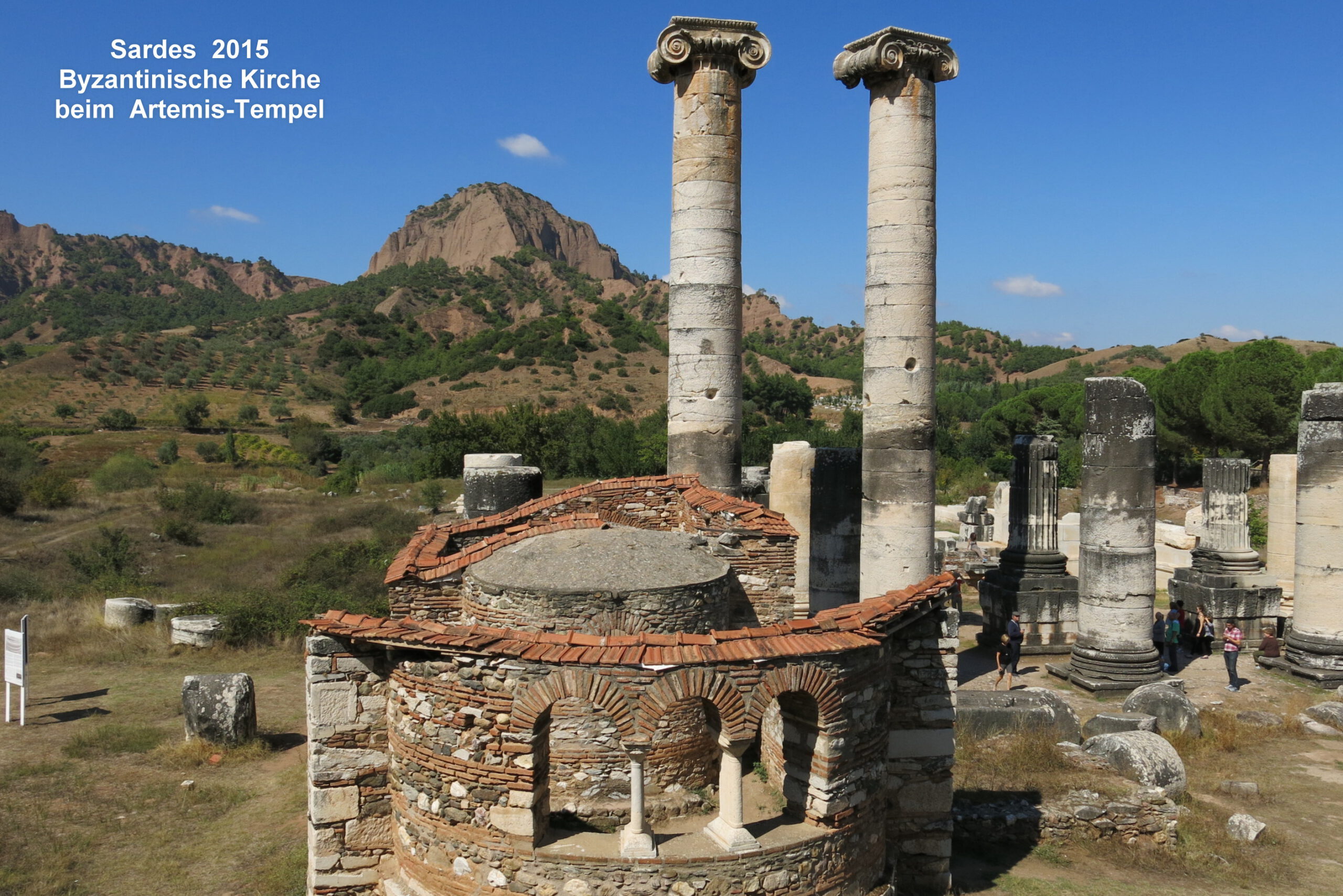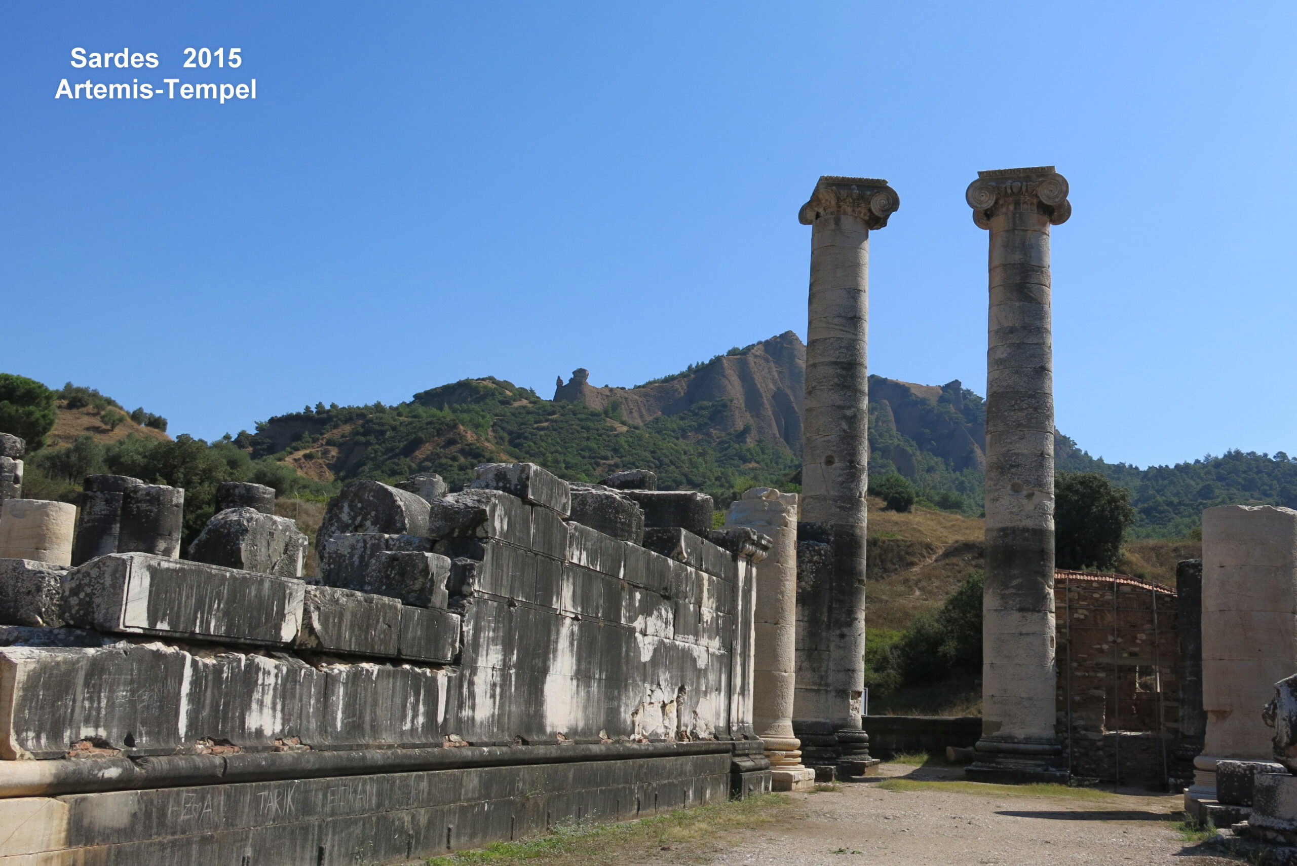 Nach religionsgeschichtlicher Darstellung soll in Sardes kurz nach dem Tod Jesu eine urchristliche Gemeinde entstanden sein, wofür die frühere Ansiedlung jüdischer Veteranen eine günstige Bedingung war. Sardes war eine der sieben Gemeinden der Offenbarung des Johannes, in der diese Gemeinden im Geiste des Urchristentums ermuntert und in ihrem urchristlichen Glauben bestärkt wurden. Die Ruinenstätte gliedert sich in zwei Bereiche: Die „alte“ Stadt wird geprägt durch den Tempel der Artemis. Die Gründung der Kultstätte der Artemis soll im 5. Jhd. v. Chr. unter griechischem Einfluss erfolgt sein. Sie führte die Tradition des lydischen Kybele-Kultes fort. Im Ionischen Aufstand von 499 v. Chr. wurde der Tempel zerstört. Der wiedererstehende Bau sollte zu den größten Tempelbauten in Kleinasien zählen, wurde aber nie vollendet. Von der geplanten Dimension des Tempels zeugen die gigantischen Säulenreste. Neben dem Tempel wurde in frühbyzantinischer Zeit eine Kapelle errichtet. Der neue Stadtteil, der von den Römern erschaffen wurde, umfasst eine spätantike Laden-Straße, eine Synagoge und einen Bad-Gymnasion-Komplex mit einer sehr großen Palästra .(Sporthof). 211 n. Chr. wurde diese Gesamtanlage fertiggestellt, deren Kernstück der vollständig restaurierte Marmorhof ist. Der Bau besticht durch seinen Marmorschmuck und die sehr gelungene Ausführung der spiralig gedrehten Kanneluren der Säulen. Die Synagoge hatte eine gediegene Marmorausstattung, beherbergte zwei Schreine für die Aufbewahrung der Thorarollen und einen Atlar, an dessen Seiten sich bis heute Löwenskulpturen befinden. Artikel bei Wikipedia zu: SARDES