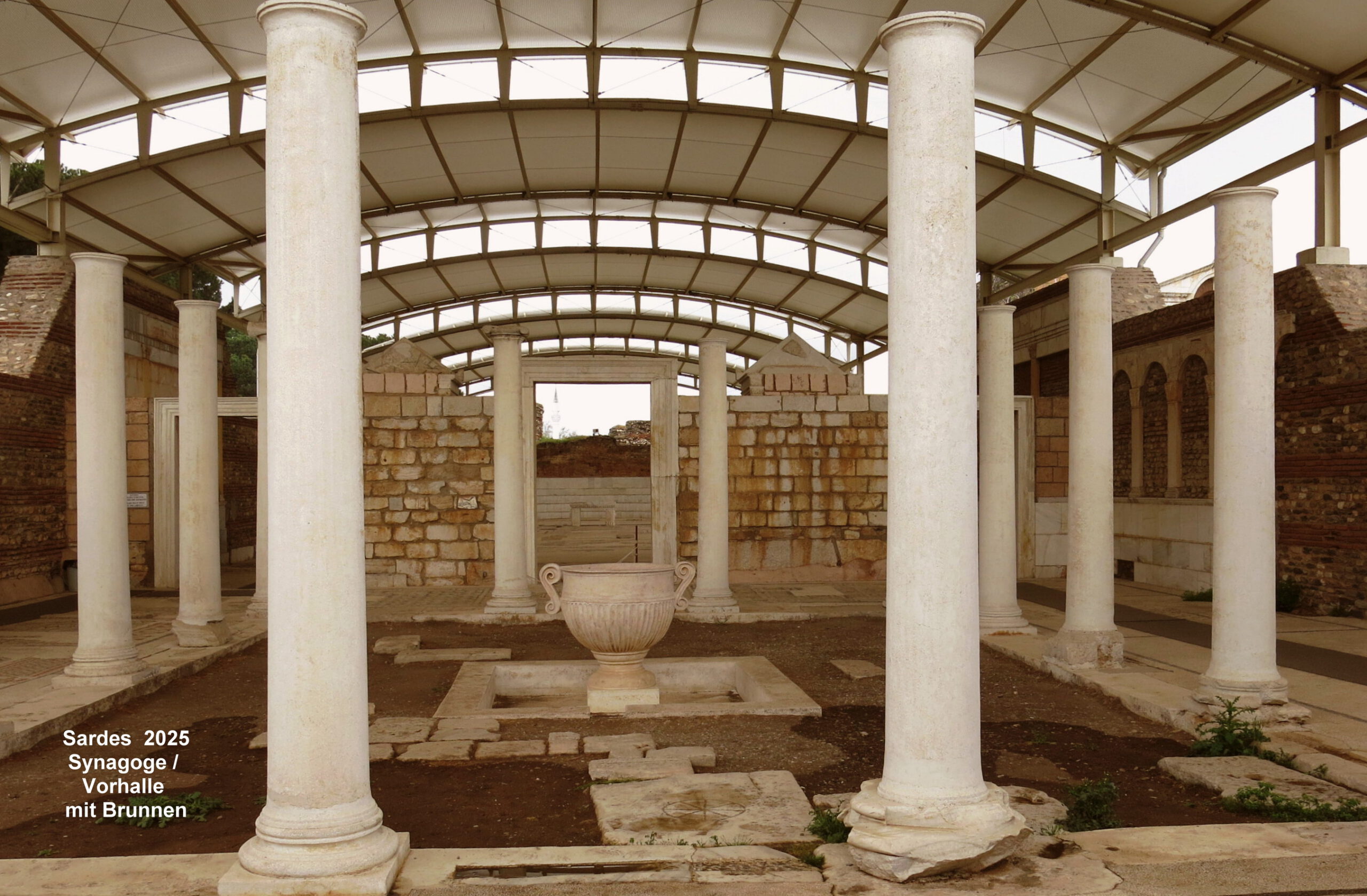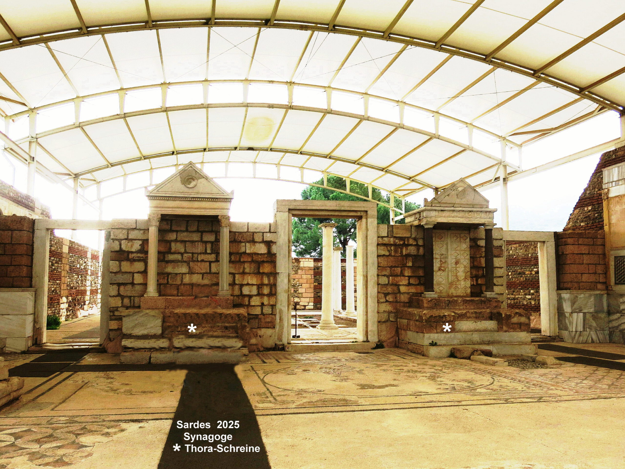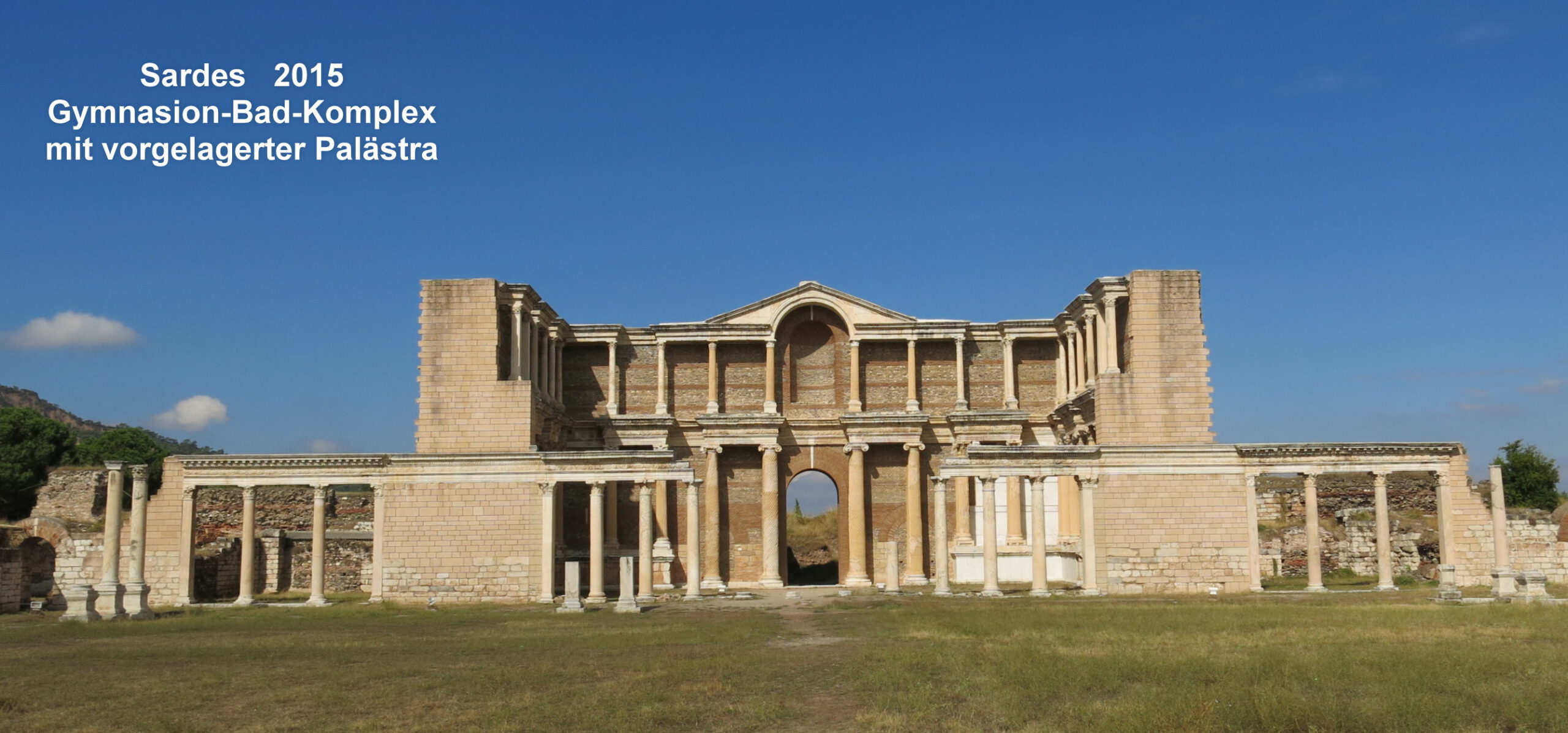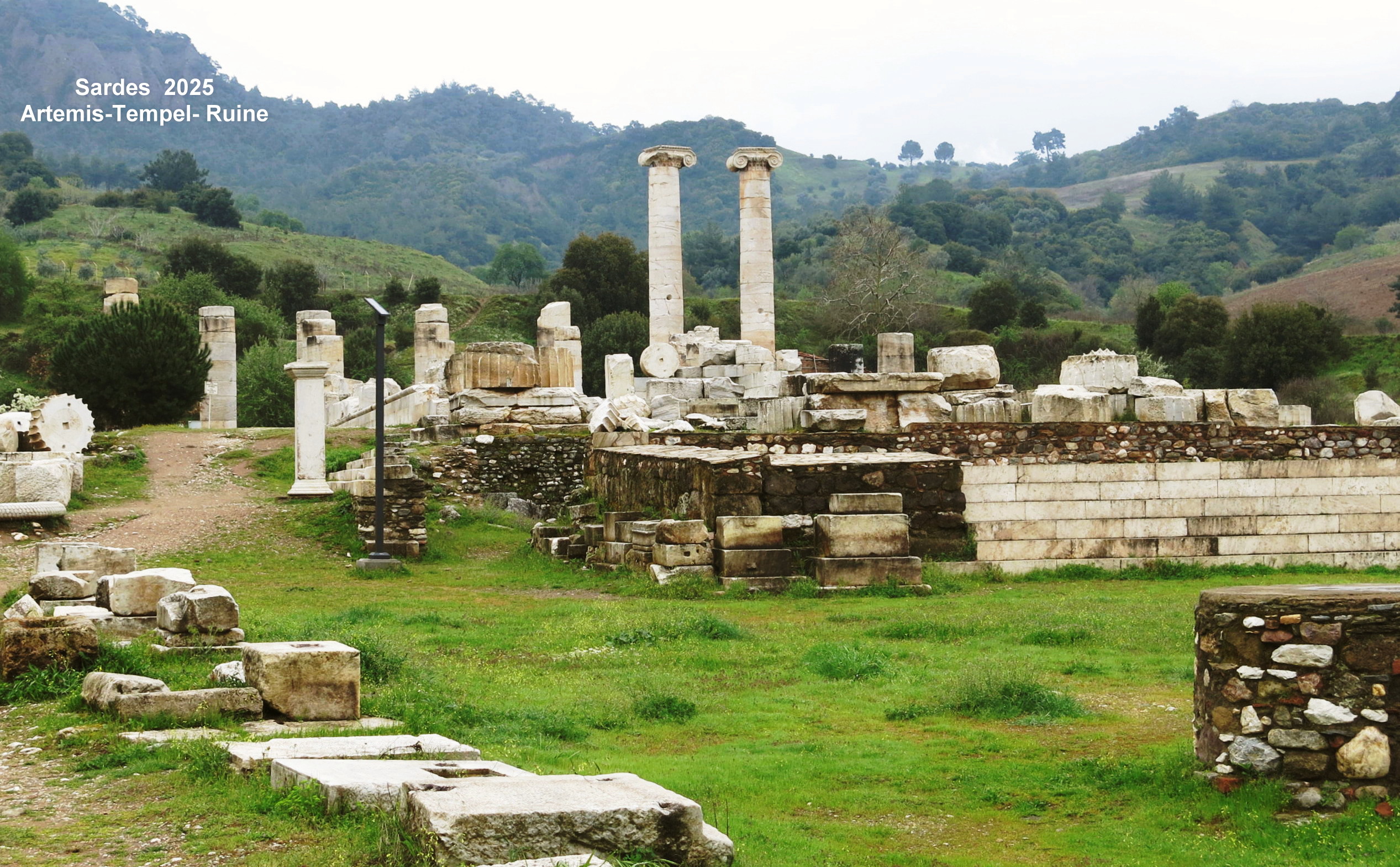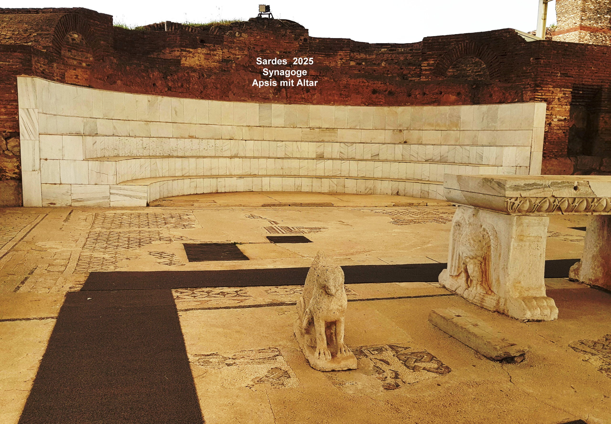 Nach religionsgeschichtlicher Darstellung soll in Sardes kurz nach dem Tod Jesu eine urchristliche Gemeinde entstanden sein, wofür die frühere Ansiedlung jüdischer Veteranen eine günstige Bedingung war. Sardes war eine der sieben Gemeinden der Offenbarung des Johannes, in der diese Gemeinden im Geiste des Urchristentums ermuntert und in ihrem urchristlichen Glauben bestärkt wurden. Die Ruinenstätte gliedert sich in zwei Bereiche: Die „alte“ Stadt wird geprägt durch den Tempel der Artemis. Die Gründung der Kultstätte der Artemis soll im 5. Jhd. v. Chr. unter griechischem Einfluss erfolgt sein. Sie führte die Tradition des lydischen Kybele-Kultes fort. Im Ionischen Aufstand von 499 v. Chr. wurde der Tempel zerstört. Der wiedererstehende Bau sollte zu den größten Tempelbauten in Kleinasien zählen, wurde aber nie vollendet. Von der geplanten Dimension des Tempels zeugen die gigantischen Säulenreste. Neben dem Tempel wurde in frühbyzantinischer Zeit eine Kapelle errichtet. Der neue Stadtteil, der von den Römern erschaffen wurde, umfasst eine spätantike Laden-Straße, eine Synagoge und einen Bad-Gymnasion-Komplex mit einer sehr großen Palästra .(Sporthof). 211 n. Chr. wurde diese Gesamtanlage fertiggestellt, deren Kernstück der vollständig restaurierte Marmorhof ist. Der Bau besticht durch seinen Marmorschmuck und die sehr gelungene Ausführung der spiralig gedrehten Kanneluren der Säulen. Die Synagoge hatte eine gediegene Marmorausstattung, beherbergte zwei Schreine für die Aufbewahrung der Thorarollen und einen Atlar, an dessen Seiten sich bis heute Löwenskulpturen befinden. Artikel bei Wikipedia zu: SARDES