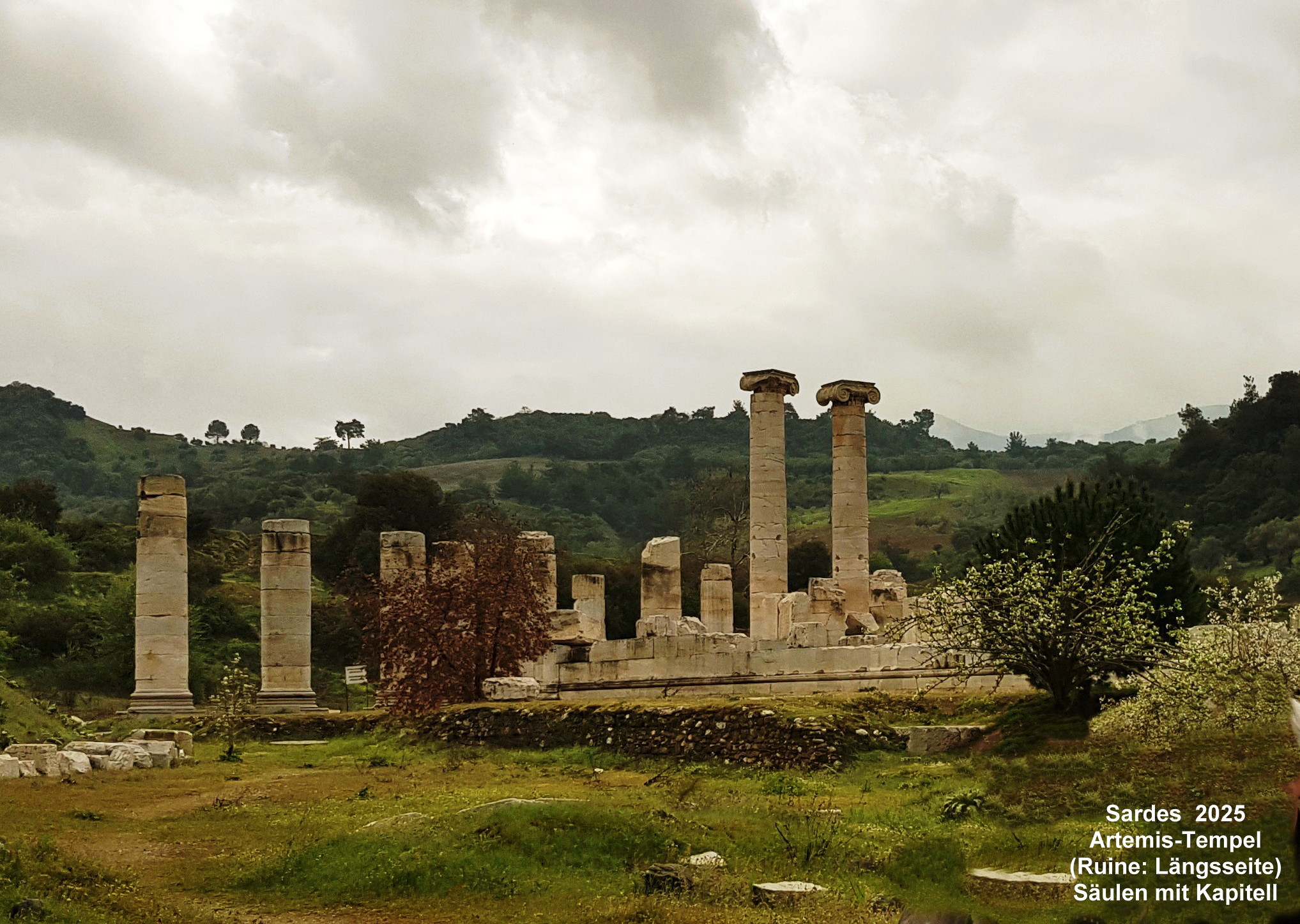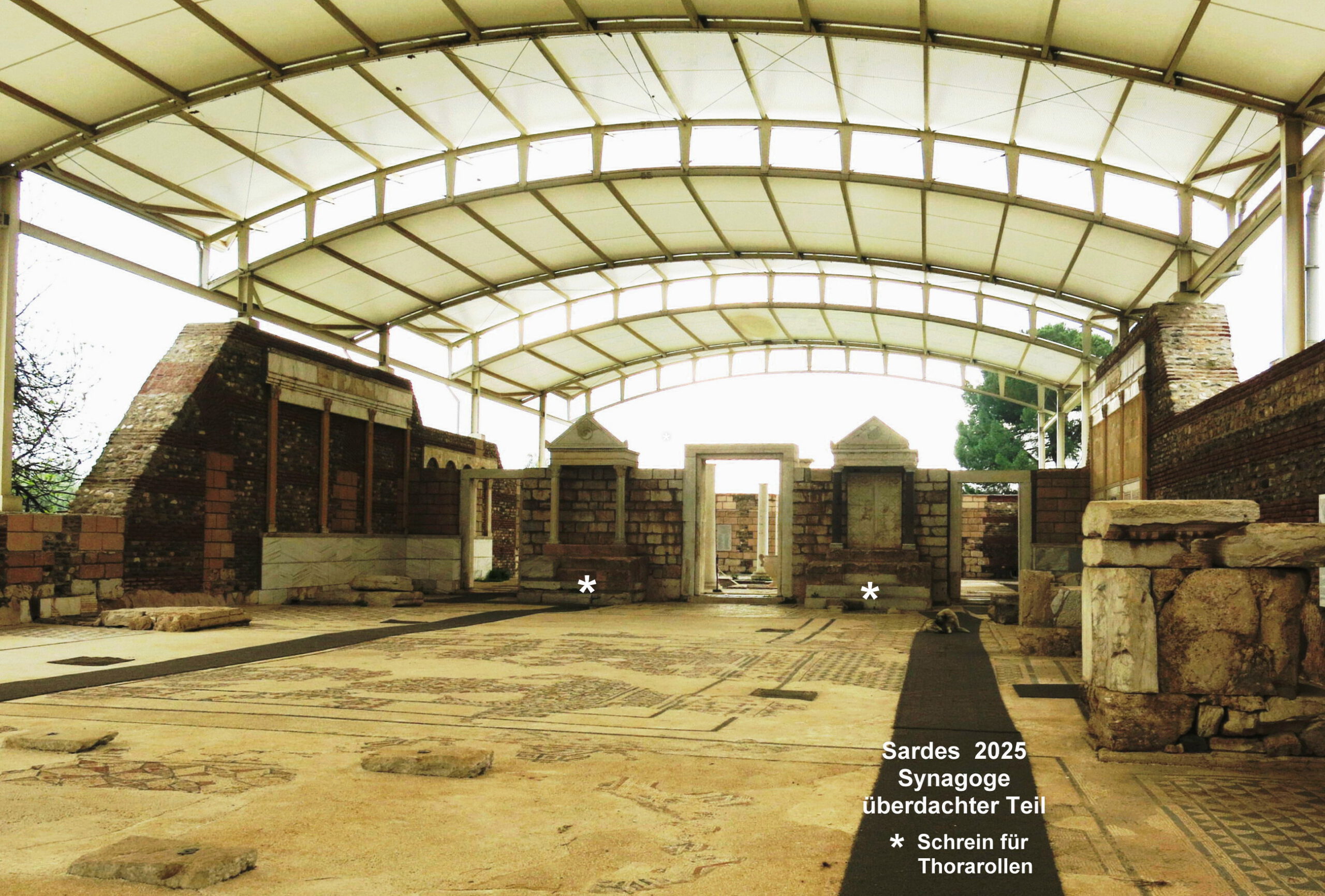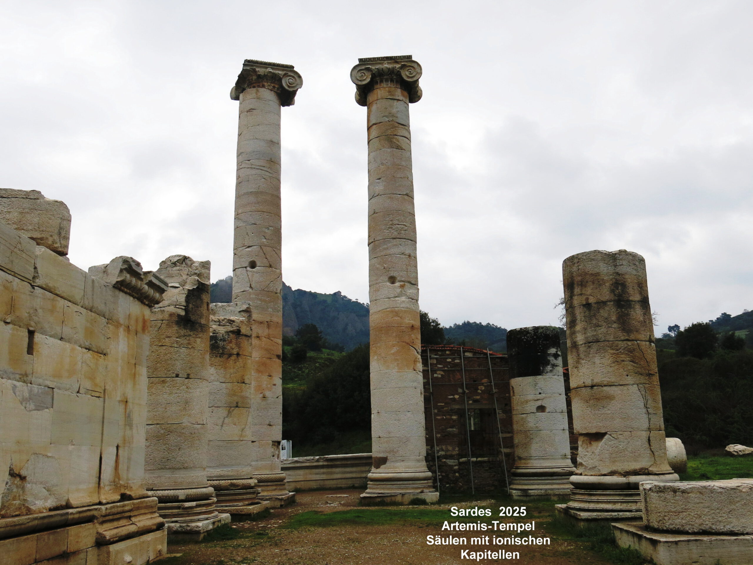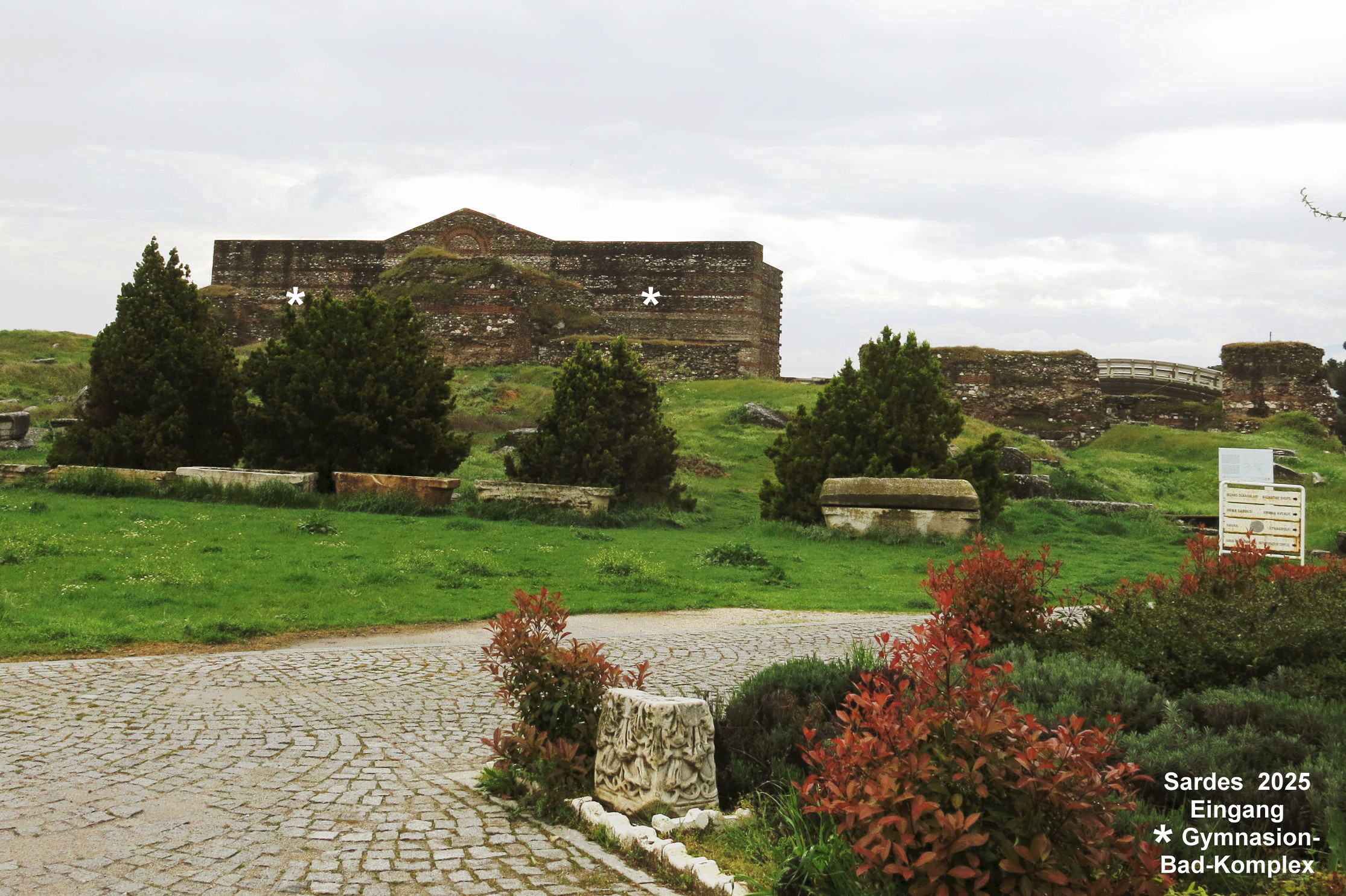 Nach religionsgeschichtlicher Darstellung soll in Sardes kurz nach dem Tod Jesu eine urchristliche Gemeinde entstanden sein, wofür die frühere Ansiedlung jüdischer Veteranen eine günstige Bedingung war. Sardes war eine der sieben Gemeinden der Offenbarung des Johannes, in der diese Gemeinden im Geiste des Urchristentums ermuntert und in ihrem urchristlichen Glauben bestärkt wurden. Die Ruinenstätte gliedert sich in zwei Bereiche: Die „alte“ Stadt wird geprägt durch den Tempel der Artemis. Die Gründung der Kultstätte der Artemis soll im 5. Jhd. v. Chr. unter griechischem Einfluss erfolgt sein. Sie führte die Tradition des lydischen Kybele-Kultes fort. Im Ionischen Aufstand von 499 v. Chr. wurde der Tempel zerstört. Der wiedererstehende Bau sollte zu den größten Tempelbauten in Kleinasien zählen, wurde aber nie vollendet. Von der geplanten Dimension des Tempels zeugen die gigantischen Säulenreste. Neben dem Tempel wurde in frühbyzantinischer Zeit eine Kapelle errichtet. Der neue Stadtteil, der von den Römern erschaffen wurde, umfasst eine spätantike Laden-Straße, eine Synagoge und einen Bad-Gymnasion-Komplex mit einer sehr großen Palästra .(Sporthof). 211 n. Chr. wurde diese Gesamtanlage fertiggestellt, deren Kernstück der vollständig restaurierte Marmorhof ist. Der Bau besticht durch seinen Marmorschmuck und die sehr gelungene Ausführung der spiralig gedrehten Kanneluren der Säulen. Die Synagoge hatte eine gediegene Marmorausstattung, beherbergte zwei Schreine für die Aufbewahrung der Thorarollen und einen Atlar, an dessen Seiten sich bis heute Löwenskulpturen befinden. Artikel bei Wikipedia zu: SARDES