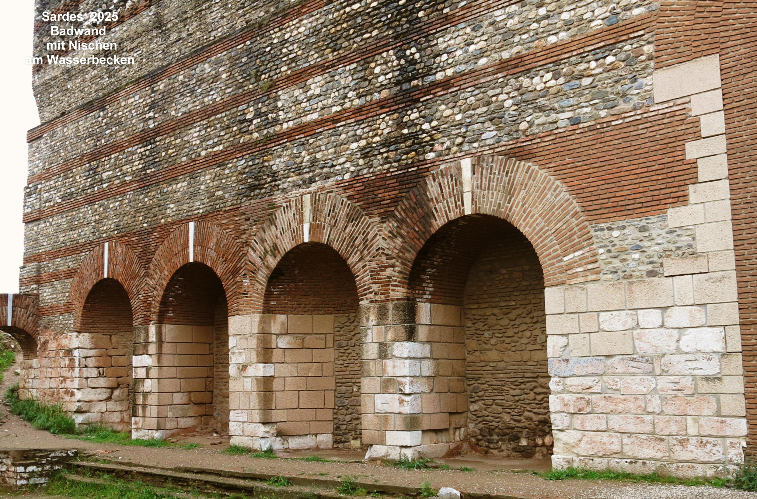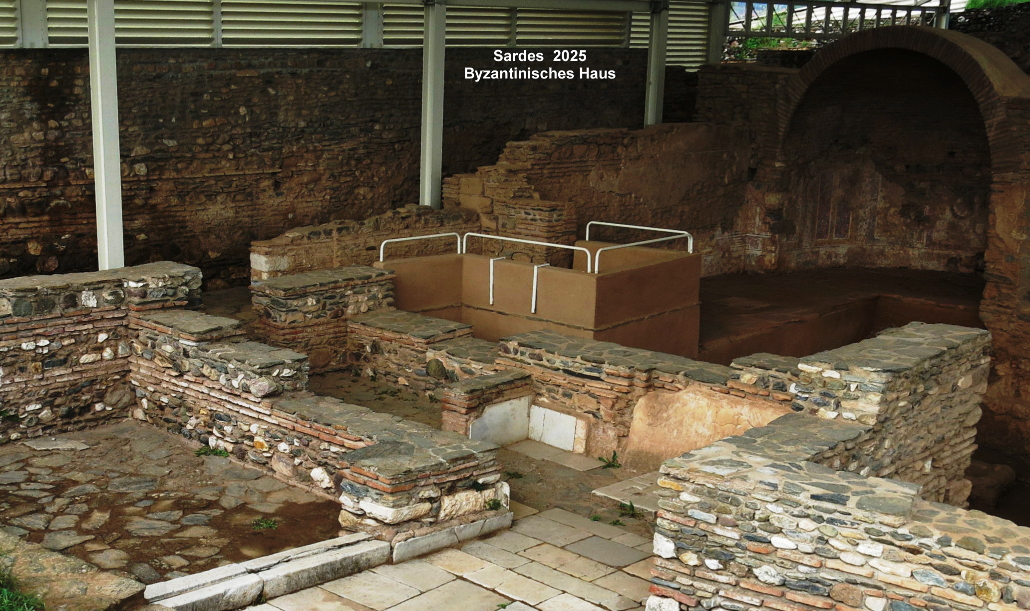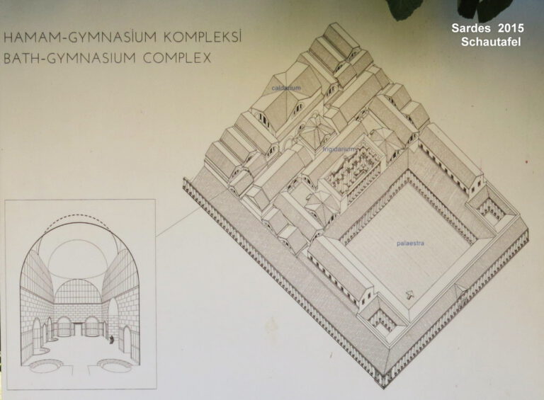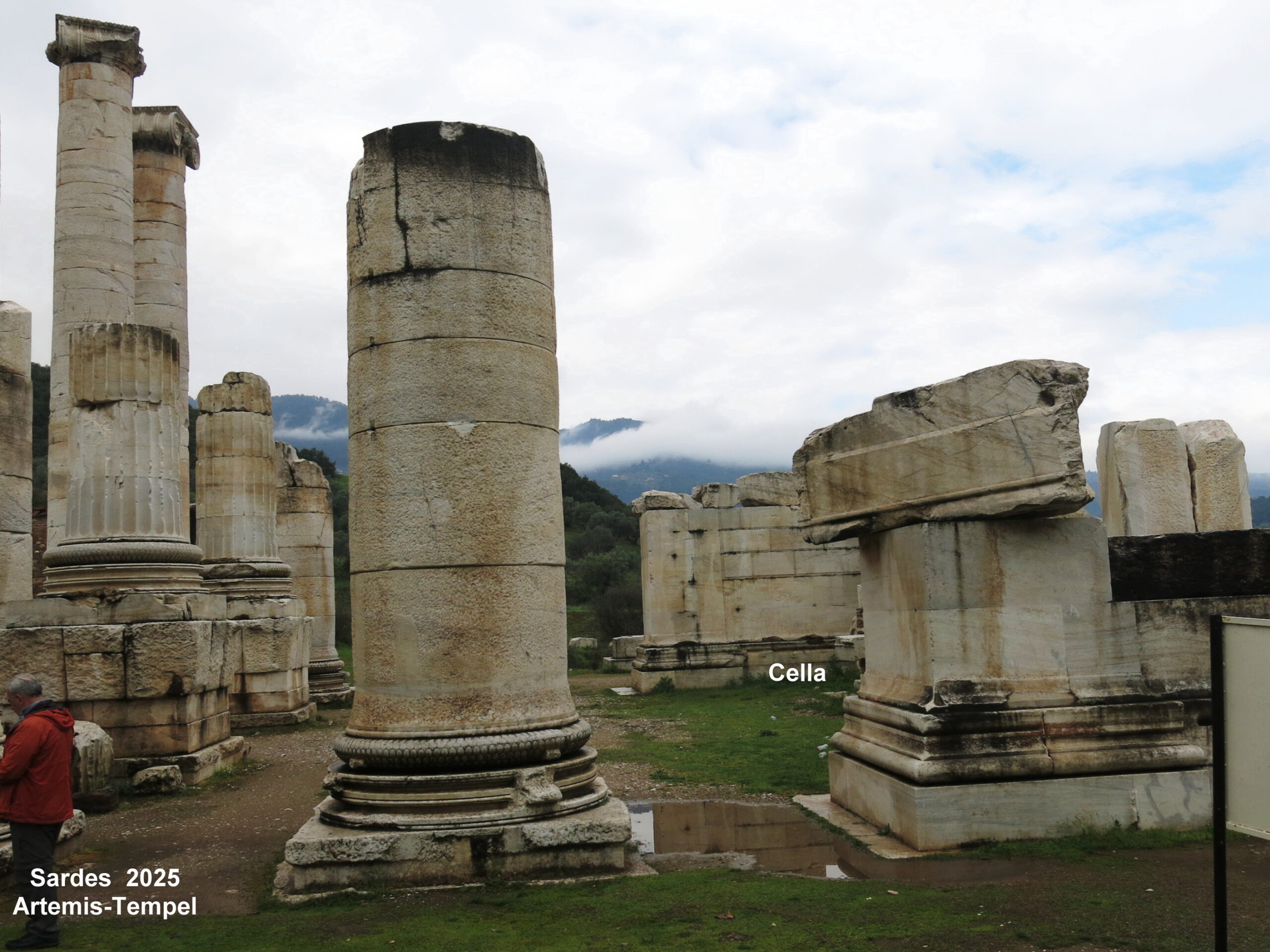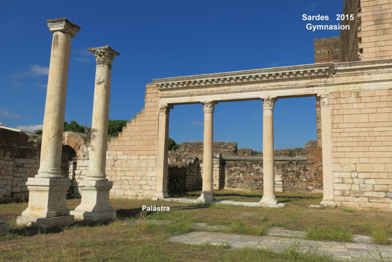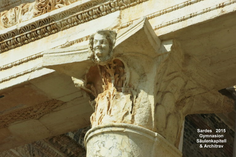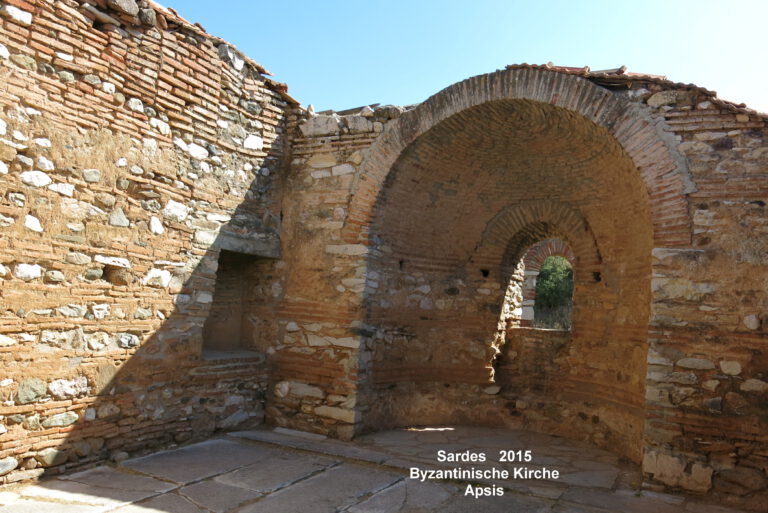Nach religionsgeschichtlicher Darstellung soll in Sardes kurz nach dem Tod Jesu eine urchristliche Gemeinde entstanden sein, wofür die frühere Ansiedlung jüdischer Veteranen eine günstige Bedingung war. Sardes war eine der sieben Gemeinden der Offenbarung des Johannes, in der diese Gemeinden im Geiste des Urchristentums ermuntert und in ihrem urchristlichen Glauben bestärkt wurden. Die Ruinenstätte gliedert sich in zwei Bereiche: Die „alte“ Stadt wird geprägt durch den Tempel der Artemis. Die Gründung der Kultstätte der Artemis soll im 5. Jhd. v. Chr. unter griechischem Einfluss erfolgt sein. Sie führte die Tradition des lydischen Kybele-Kultes fort. Im Ionischen Aufstand von 499 v. Chr. wurde der Tempel zerstört. Der wiedererstehende Bau sollte zu den größten Tempelbauten in Kleinasien zählen, wurde aber nie vollendet. Von der geplanten Dimension des Tempels zeugen die gigantischen Säulenreste. Neben dem Tempel wurde in frühbyzantinischer Zeit eine Kapelle errichtet. Der neue Stadtteil, der von den Römern erschaffen wurde, umfasst eine spätantike Laden-Straße, eine Synagoge und einen Bad-Gymnasion-Komplex mit einer sehr großen Palästra .(Sporthof). 211 n. Chr. wurde diese Gesamtanlage fertiggestellt, deren Kernstück der vollständig restaurierte Marmorhof ist. Der Bau besticht durch seinen Marmorschmuck und die sehr gelungene Ausführung der spiralig gedrehten Kanneluren der Säulen. Die Synagoge hatte eine gediegene Marmorausstattung, beherbergte zwei Schreine für die Aufbewahrung der Thorarollen und einen Atlar, an dessen Seiten sich bis heute Löwenskulpturen befinden. Artikel bei Wikipedia zu: SARDES