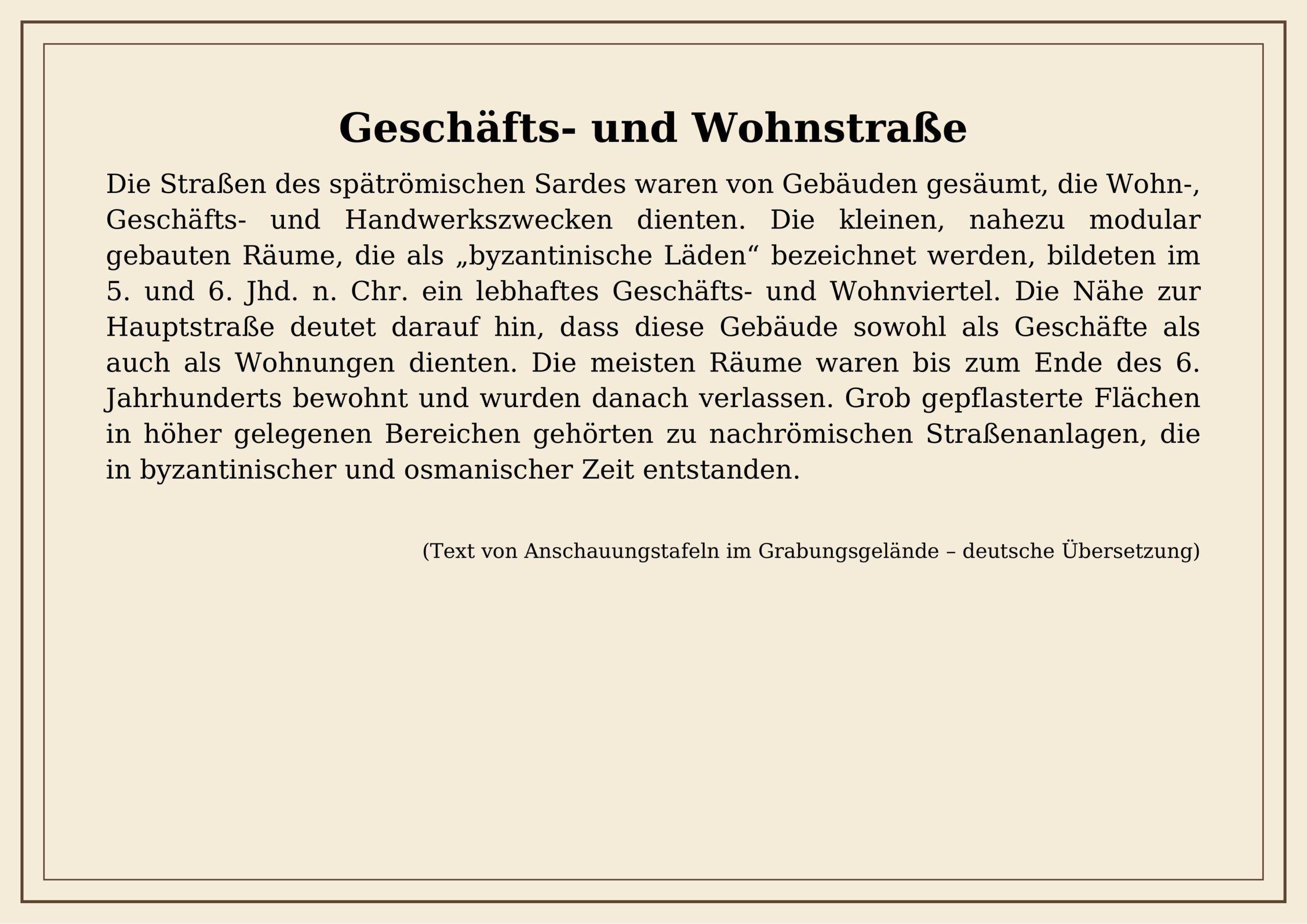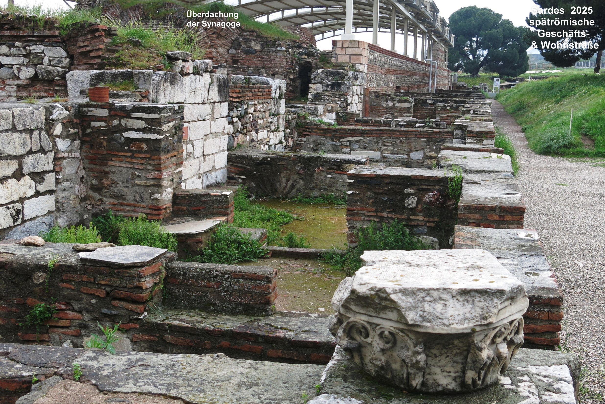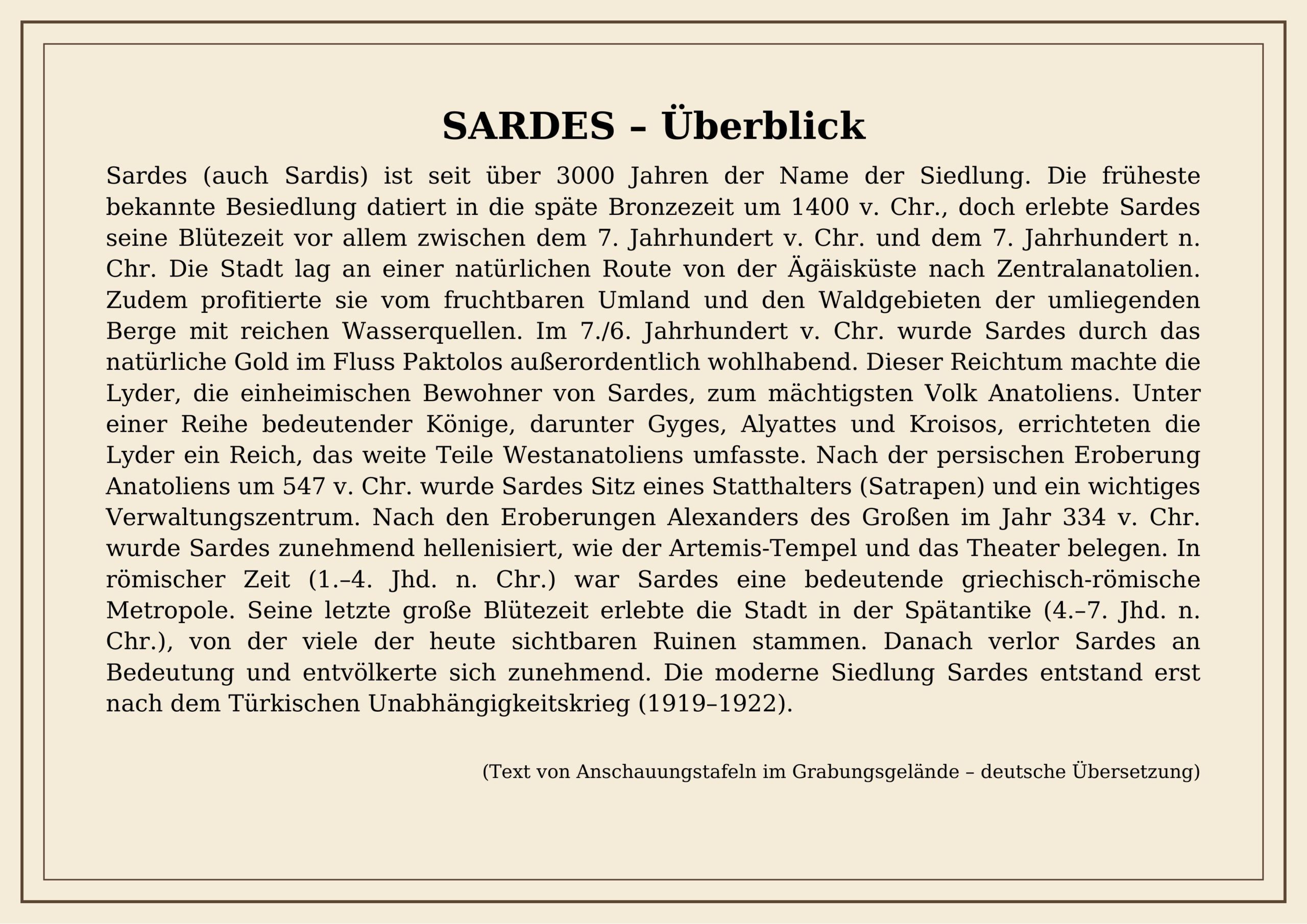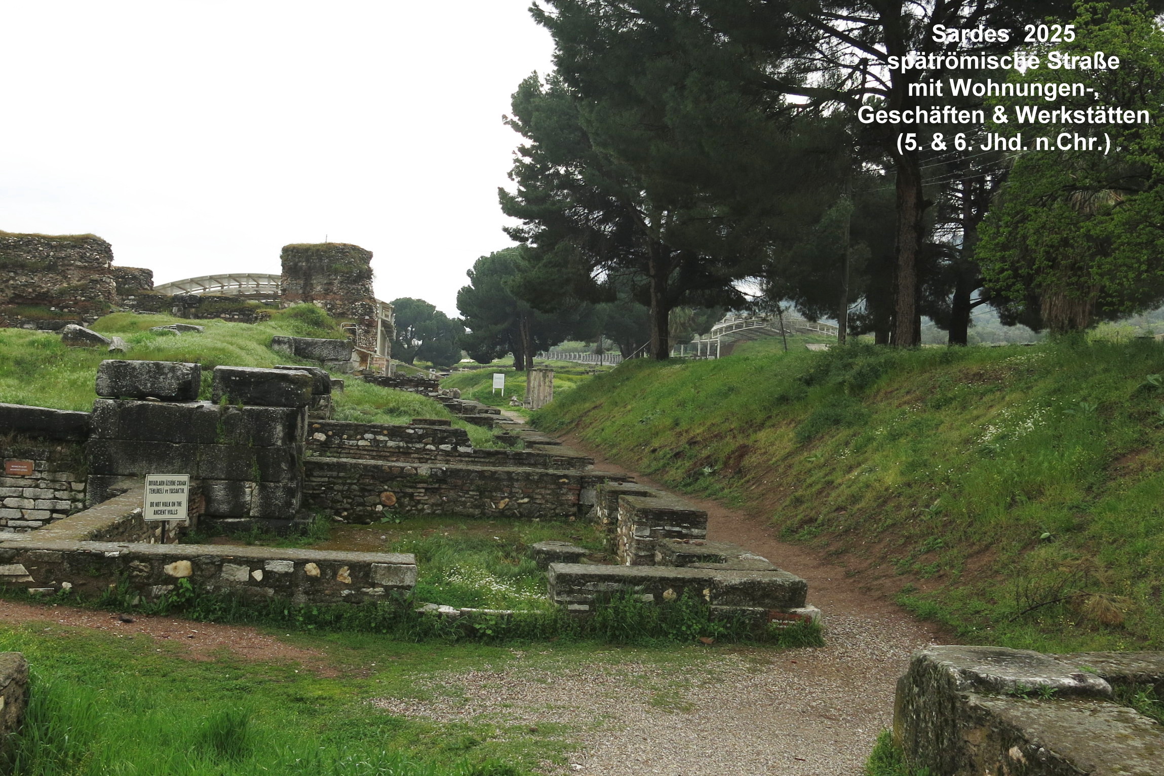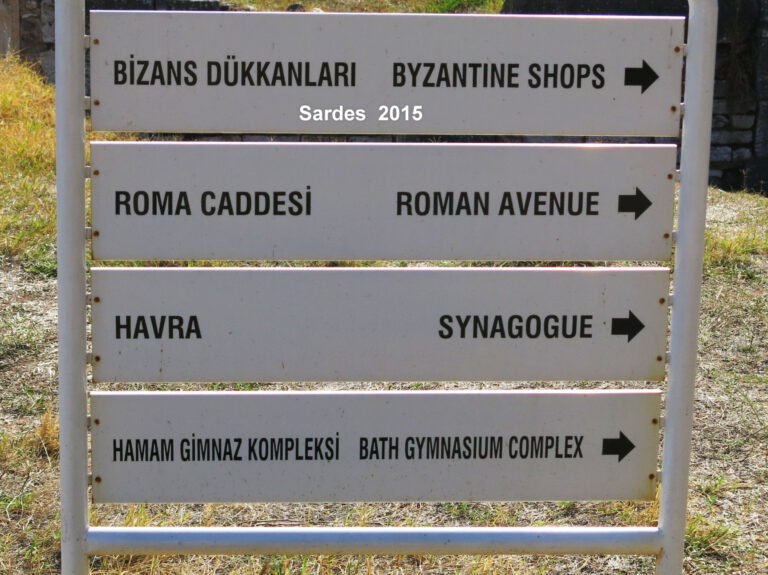 Nach religionsgeschichtlicher Darstellung soll in Sardes kurz nach dem Tod Jesu eine urchristliche Gemeinde entstanden sein, wofür die frühere Ansiedlung jüdischer Veteranen eine günstige Bedingung war. Sardes war eine der sieben Gemeinden der Offenbarung des Johannes, in der diese Gemeinden im Geiste des Urchristentums ermuntert und in ihrem urchristlichen Glauben bestärkt wurden. Die Ruinenstätte gliedert sich in zwei Bereiche: Die „alte“ Stadt wird geprägt durch den Tempel der Artemis. Die Gründung der Kultstätte der Artemis soll im 5. Jhd. v. Chr. unter griechischem Einfluss erfolgt sein. Sie führte die Tradition des lydischen Kybele-Kultes fort. Im Ionischen Aufstand von 499 v. Chr. wurde der Tempel zerstört. Der wiedererstehende Bau sollte zu den größten Tempelbauten in Kleinasien zählen, wurde aber nie vollendet. Von der geplanten Dimension des Tempels zeugen die gigantischen Säulenreste. Neben dem Tempel wurde in frühbyzantinischer Zeit eine Kapelle errichtet. Der neue Stadtteil, der von den Römern erschaffen wurde, umfasst eine spätantike Laden-Straße, eine Synagoge und einen Bad-Gymnasion-Komplex mit einer sehr großen Palästra .(Sporthof). 211 n. Chr. wurde diese Gesamtanlage fertiggestellt, deren Kernstück der vollständig restaurierte Marmorhof ist. Der Bau besticht durch seinen Marmorschmuck und die sehr gelungene Ausführung der spiralig gedrehten Kanneluren der Säulen. Die Synagoge hatte eine gediegene Marmorausstattung, beherbergte zwei Schreine für die Aufbewahrung der Thorarollen und einen Atlar, an dessen Seiten sich bis heute Löwenskulpturen befinden. Artikel bei Wikipedia zu: SARDES